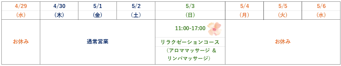 2026年GW休暇のお知らせ いつも当院をご利用いただき、誠に有難うございます。 2026年ゴールデンウイーク期間中の休業日を下記の通りお知らせいたします。※5月3日(日)は11:00-17:00の時間帯でリラクゼーション(アロママッサージ&リンパマッサージ)コースを営業しております。 5月7日((木)より通常営業となります。 皆様にはご迷惑をおかけいたしますが、何卒ご理解の程お願い申し上げます。 春の彩りがいっそう深まる折、心穏やかな日々をお過ごしくださいませ。 総合治療院 陽’ 伊藤